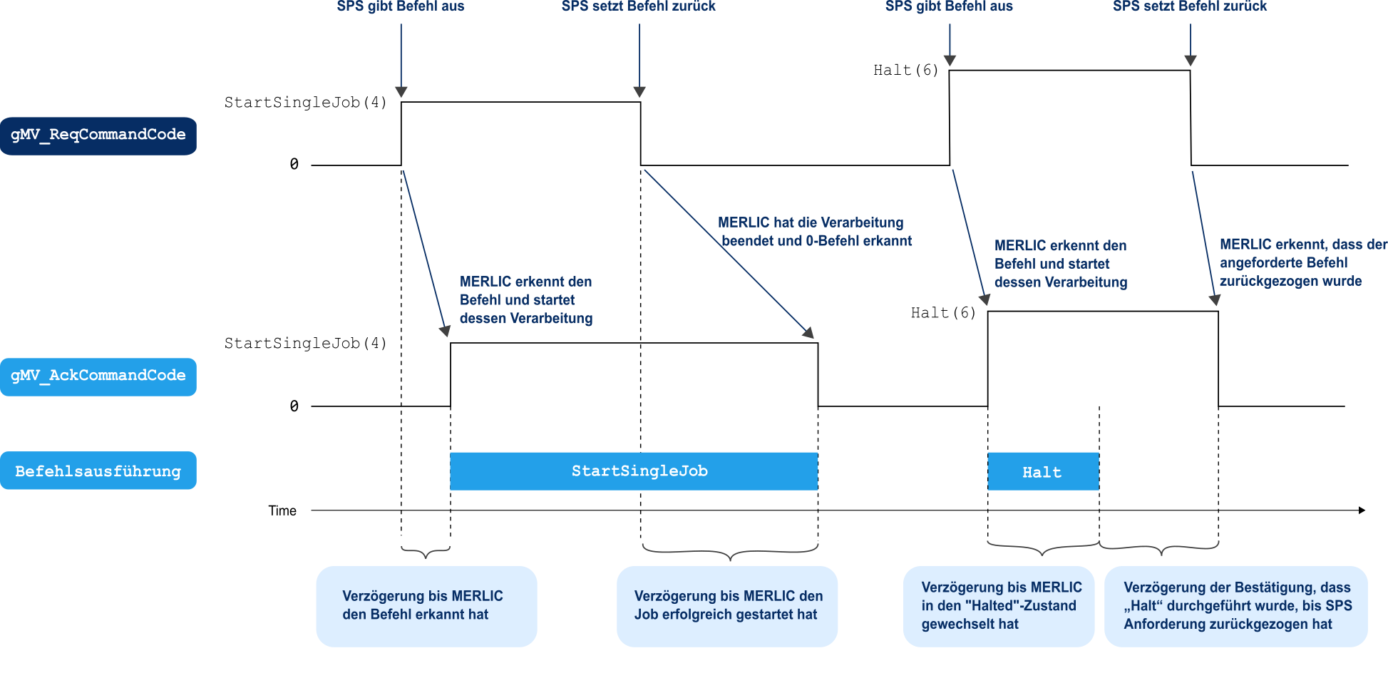 Wenn die Ausführung des Befehls beendet wurde und die SPS das Feld „gMV_ReqCommandCode“ bereits auf 0 zurückgesetzt hat, wird das Feld „gMV_AckCommandCode“ ebenfalls auf 0 zurückgesetzt. Die SPS kann jetzt davon ausgehen, dass der Befehl ausgeführt wurde und das Bildverarbeitungssystem den nächsten Befehl empfangen kann. Die folgende Grafik veranschaulicht den Handshake-Prozess mit den Befehlen „StartSingleJob“ und „Halt“ als Beispiel.