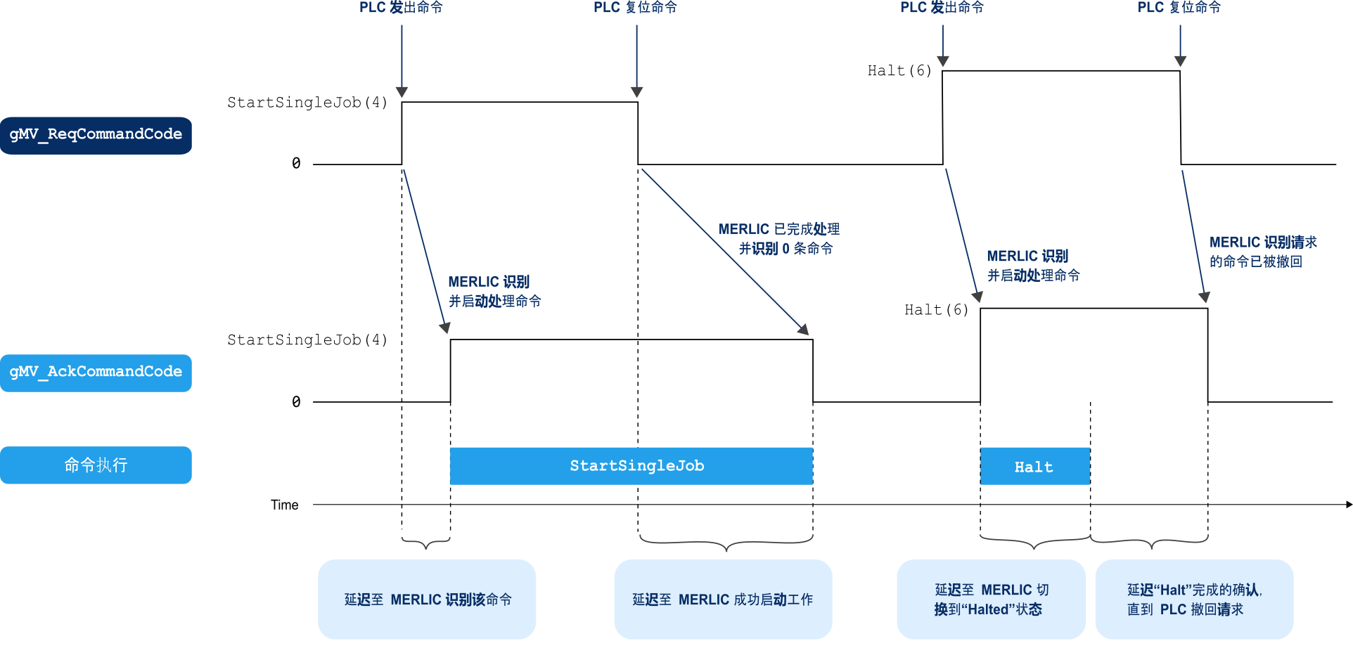 如果命令已完成执行,且 PLC 已将“gMV_ReqCommandCode”字段重置为 0,则“gMV_AckCommandCode”字段也会被重置为 0。PLC 现在可以假设命令已经完成,并且视觉系统已经准备好接收下一个命令。下图以“StartSingleJob”和“Halt”命令为例显示了握手过程。