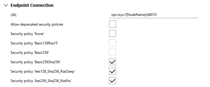 如果设置此参数,则启用消息安全模式为“Sign”和“Sign & Encrypt”的安全策略“Aes128-Sha256-RsaOaep”。默认情况下已设置该参数。