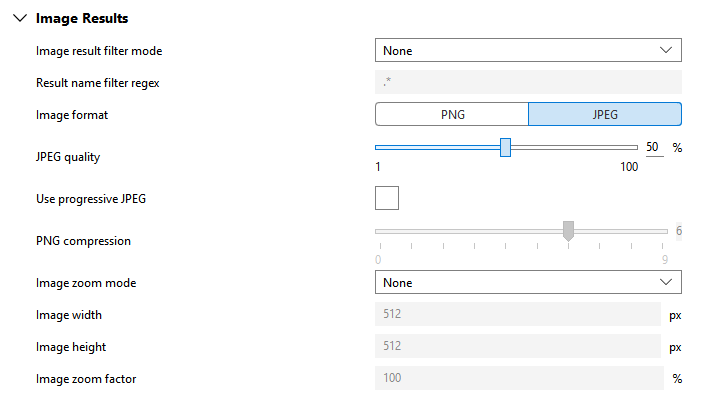 此类别中的参数定义如何提供结果图像。仅当设置了类别“JobExecutor Interface”中的参数“Add image results”时,这些参数才可配置。