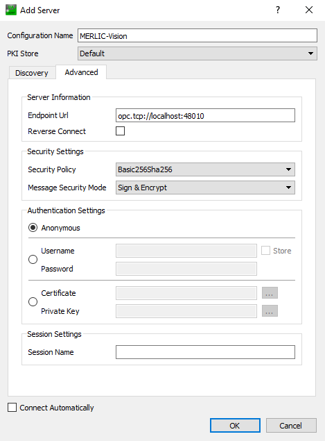 - 单击“确定”按钮保存配置。在我们的示例中,服务器配置现在设置为在端口“48010”上侦听客户端,并使用安全策略“Basic256Sha256”。