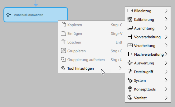 In einigen Fällen ist es u. U. schneller, ein Tool oder mehrere Tools im Tool-Flow-Panel zu kopieren, anstatt sie von Grund auf neu zu erstellen. Es ist auch möglich, Tools aus einer MERLIC-Instanz in eine andere MERLIC-Instanz zu kopieren, wenn Sie die gleichen Tools in einer neuen oder anderen MVApp verwenden möchten. Sie können ein Tool im Tool-Flow-Panel über das Kontextmenü oder mit Tastenkombinationen kopieren.