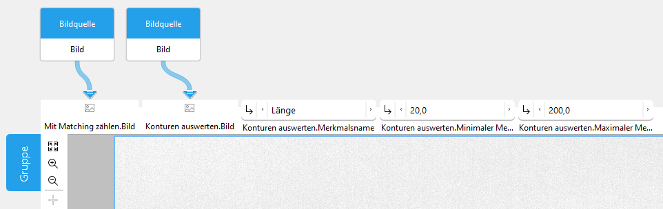 Für einen Parameter einer Gruppe werden immer der Name des jeweiligen Tools sowie der Name des Parameters angezeigt, z. B. „Mit Matching zählen.Bild“. So können Sie leicht erkennen, welchem Tool ein Parameter zugewiesen ist. Wenn viele Parameter an der Gruppe vorhanden sind, sodass deren Namen nicht vollständig sichtbar sind, können Sie den Mauszeiger über einen Parameternamen bewegen, um den vollständigen Namen im Tooltip anzuzeigen.