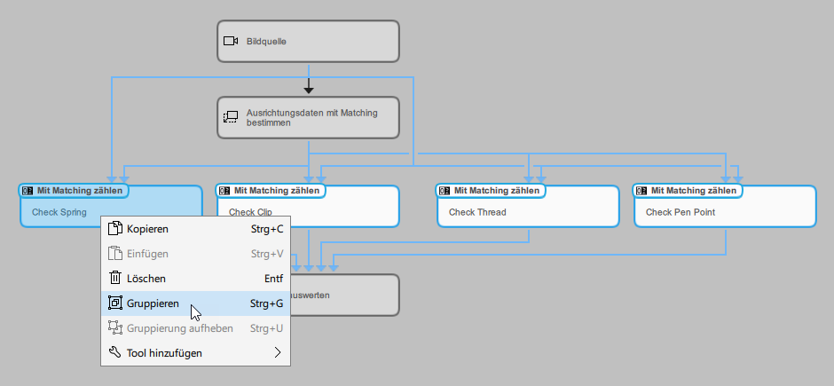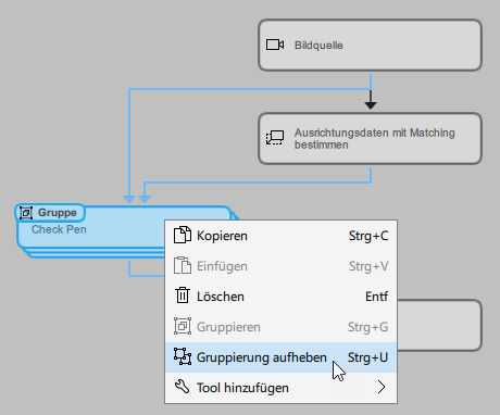 Gruppieren“ aus. Alternativ können Sie die Tastenkombination Strg+G verwenden. Wenn es nicht möglich ist, die ausgewählten Tools aufgrund von Einschränkungen zu gruppieren, ist der Kontextmenüeintrag ausgegraut und die Tastenkombination ist nicht verfügbar.