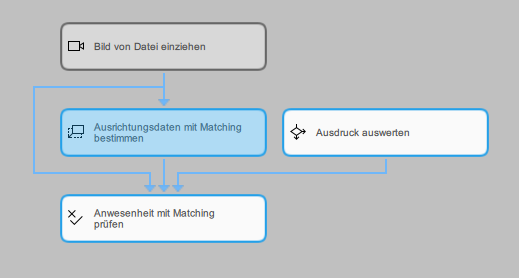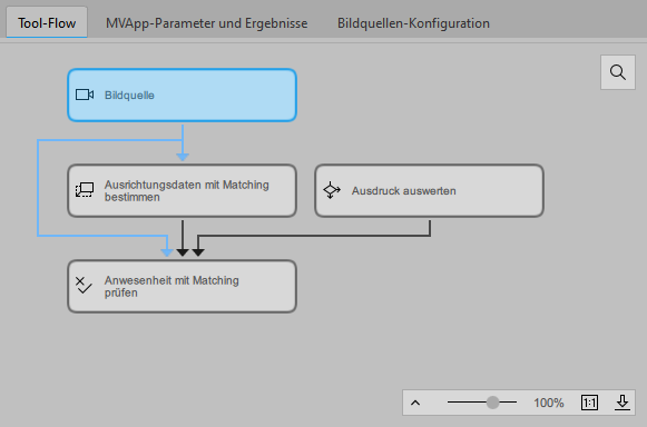 Im Tool-Flow-Panel sind drei Tools des Tool-Flows ausgewählt. Das Tool Ausrichtungsdaten mit Matching bestimmen ist das Fokustool Beim Fokustool handelt es sich um das bearbeitbare Tool, das im Tool-Arbeitsbereich angezeigt wird. Es dient auch als Referenzposition, wenn mehrere Tools im Tool-Flow-Panel verschoben werden.. Es ist daher das aktive Tool und wird im Tool-Arbeitsbereich angezeigt.