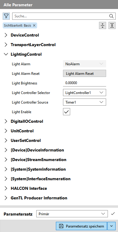Die Parameter des Peripheriegeräts befinden sich auf der rechten Seite im Abschnitt „Alle Parameter“. Dort werden alle Parameter angezeigt, die für das jeweilige Gerät verfügbar sind.