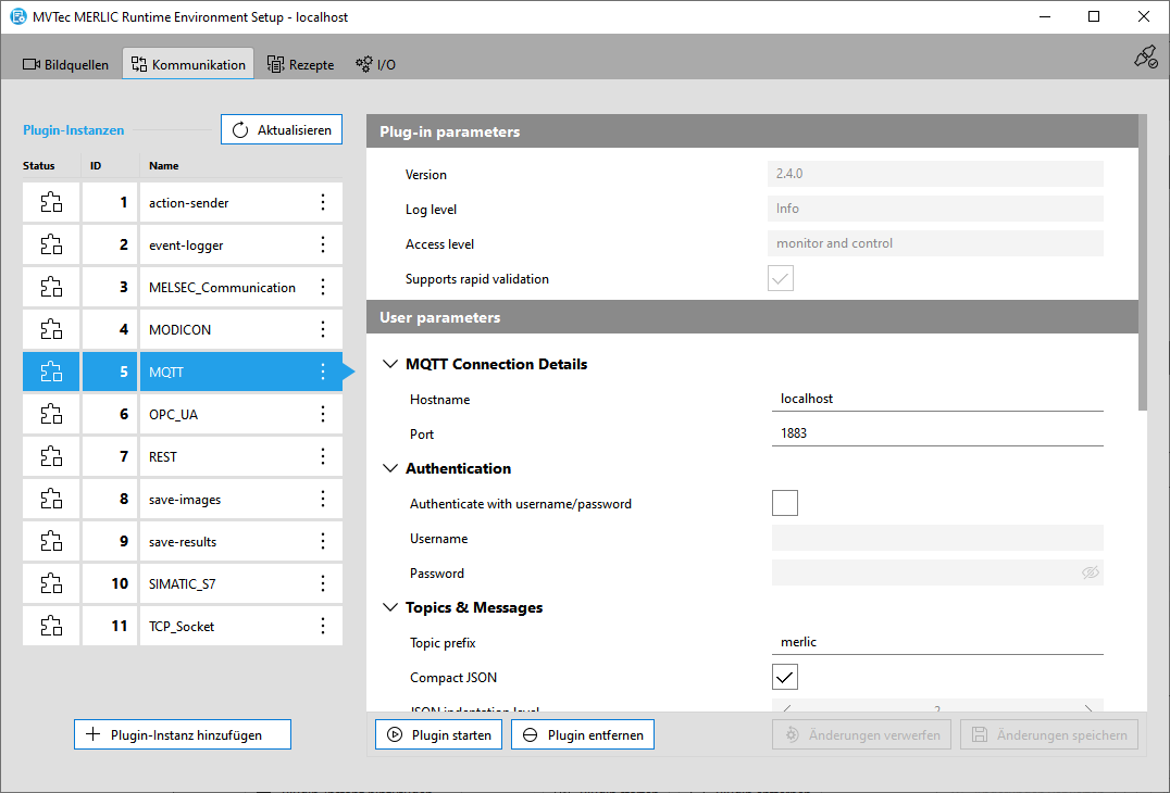 Auf der Registerkarte „ Kommunikation“ des MERLIC RTE Setups können Sie alle Communicator-Plugins konfigurieren, d. h. Plugins, die über den MERLIC Communicator für die Prozessintegration gestartet werden müssen. Communicator-Plugins können mehrmals instanziiert werden, d. h., Sie können mehrere Instanzen eines Plugins in einer bestimmten Konfiguration verwenden. Im MERLIC RTE Setup können Sie daher Instanzen des jeweiligen Plugins bearbeiten. Wenn Sie eine neue Plugin-Instanz hinzufügen, können Sie die aktuelle Konfiguration für die Instanz überprüfen und die verfügbaren Benutzerparameter anpassen, die in der Implementierung des jeweiligen Plugins definiert wurden. Darüber hinaus können Sie auch die ausgewählten Instanzen der Communicator-Plugins im MERLIC RTE Setup starten und beenden.