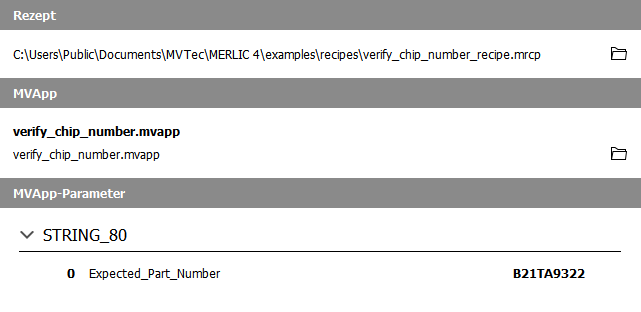 Auf der Registerkarte „Rezepte“ des MERLIC RTE Setups werden ausführliche Informationen zu den importierten Rezepten Eine MERLIC-Rezeptdatei ist ein wesentlicher Bestandteil der MERLIC-Prozessintegration. Dabei handelt es sich um eine separate Datei (mit der Dateiendung .mrcp), die definiert, welche MERLIC-Vision-App für die Prozessintegration geladen wird. Sie definiert außerdem, wie die MVApp parametrisiert wird, da sie mehrere vordefinierte Eingabewerte für ausgewählte Toolparameter enthält. Sie können mehrere Rezeptdateien mit individuellen Eingabewerten für ein und dieselbe MVApp erstellen. Auf diese Weise können Sie eine MVApp mit verschiedenen Parametereinstellungen für unterschiedliche Szenarien der Anwendung verwenden. Darüber hinaus können Sie eine Rezeptdatei verwenden, um eine MVApp für eine völlig andere Bildverarbeitungsaufgabe zu laden. angezeigt, die für die Prozessintegration MERLIC kann in industriellen Bildverarbeitungssystemen, die in eine Fertigungseinrichtung integriert sind, eingesetzt werden. Die Maschinensteuerung, z. B. eine SPS (speicherprogrammierbare Steuerung), muss in der Lage sein, ein integriertes Erkennungssystem zu steuern, die Ausführung zu überwachen und die Ergebnisse abzufragen. MERLIC verfügt daher über einen Prozessintegrationsmodus, der eine Kommunikation mit einer Maschinensteuerung ermöglicht. Der Prozessintegrationsmodus kann über die Anwendung „MERLIC RTE“ gestartet werden, die mit der MERLIC-Installation bereitgestellt wird. verfügbar sind. Sie können feststellen, welche MERLIC-Vision-App von einem bestimmten Rezept parametrisiert wird und wie die Eingabewerte definiert sind. Darüber hinaus können Sie wichtige Informationen wie die ID eines Rezepts auf der Registerkarte „Rezepte“ ermitteln.