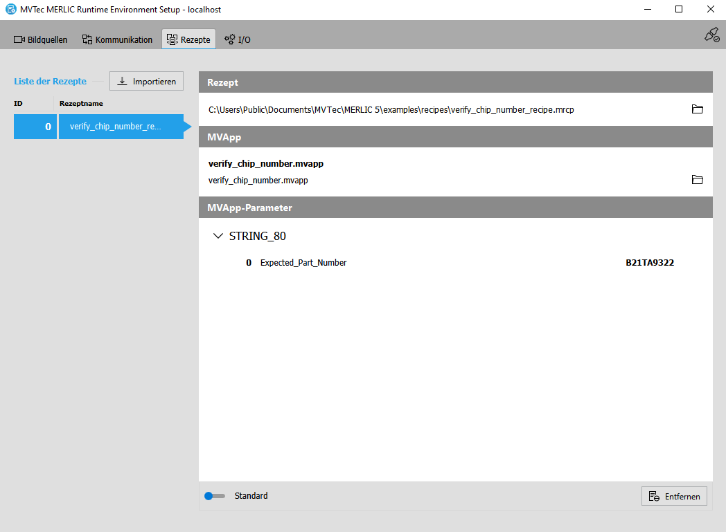 In diesem Abschnitt wird beschrieben, wie Sie Rezeptdateien Eine MERLIC-Rezeptdatei ist ein wesentlicher Bestandteil der MERLIC-Prozessintegration. Dabei handelt es sich um eine separate Datei (mit der Dateiendung .mrcp), die definiert, welche MERLIC-Vision-App für die Prozessintegration geladen wird. Sie definiert außerdem, wie die MVApp parametrisiert wird, da sie mehrere vordefinierte Eingabewerte für ausgewählte Toolparameter enthält. Sie können mehrere Rezeptdateien mit individuellen Eingabewerten für ein und dieselbe MVApp erstellen. Auf diese Weise können Sie eine MVApp mit verschiedenen Parametereinstellungen für unterschiedliche Szenarien der Anwendung verwenden. Darüber hinaus können Sie eine Rezeptdatei verwenden, um eine MVApp für eine völlig andere Bildverarbeitungsaufgabe zu laden. in die Registerkarte „Rezepte“ importieren oder daraus entfernen, die ID von Rezepten ändern und Standardrezepte festlegen. Rezepte, die nicht in die Registerkarte „Rezepte“ importiert wurden, sind nicht für die MERLIC-Prozessintegration MERLIC kann in industriellen Bildverarbeitungssystemen, die in eine Fertigungseinrichtung integriert sind, eingesetzt werden. Die Maschinensteuerung, z. B. eine SPS (speicherprogrammierbare Steuerung), muss in der Lage sein, ein integriertes Erkennungssystem zu steuern, die Ausführung zu überwachen und die Ergebnisse abzufragen. MERLIC verfügt daher über einen Prozessintegrationsmodus, der eine Kommunikation mit einer Maschinensteuerung ermöglicht. Der Prozessintegrationsmodus kann über die Anwendung „MERLIC RTE“ gestartet werden, die mit der MERLIC-Installation bereitgestellt wird. verfügbar. Daher müssen die gewünschten Rezepte unbedingt importiert werden, bevor MERLIC im Prozessintegrationsmodus gestartet wird. Weitere Informationen zum Erstellen von Rezepten finden Sie unter MERLIC-Rezept erstellen.