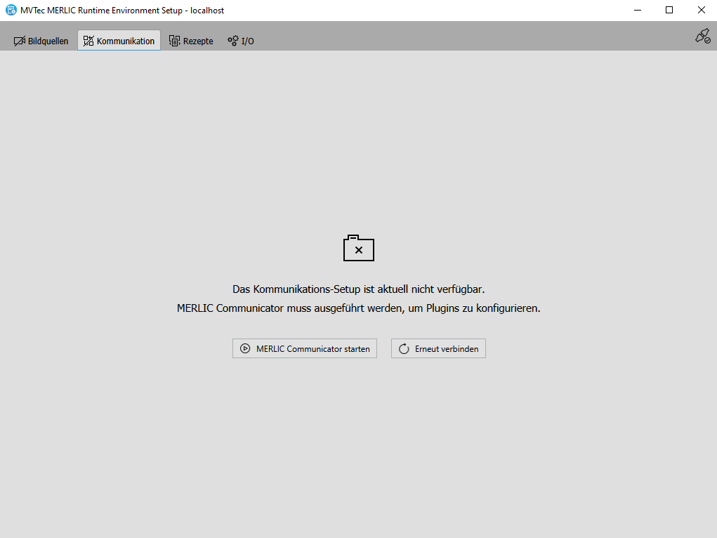 Wenn Sie mit dem lokalen System verbunden sind und die Verbindung zum Konfigurationsdienst für die Registerkarte „Kommunikation“ getrennt wurde, können Sie den MERLIC Communicator im MERLIC RTE Setup bequem über die Schaltfläche „MERLIC Communicator starten“ neu starten. Wenn Sie den MERLIC Communicator außerhalb des MERLIC RTE Setups gestartet haben, z. B. über das Windows-Startmenü, können Sie die Verbindung zum jeweiligen Konfigurationsdienst auch über die Schaltfläche „Erneut verbinden“ wiederherstellen. Dies ist ebenfalls notwendig, wenn Sie mit einem Remote-System verbunden sind, weil Sie zuerst den MERLIC Communicator auf dem Remote-System starten müssen, damit die Verbindung zum Konfigurationsdienst über die Schaltfläche „Erneut verbinden“ wiederhergestellt werden kann. Allerdings gehen alle nicht gespeicherten Änderungen der Plugin-Konfiguration verloren, wenn die Verbindung zum Konfigurationsdienst getrennt wird.