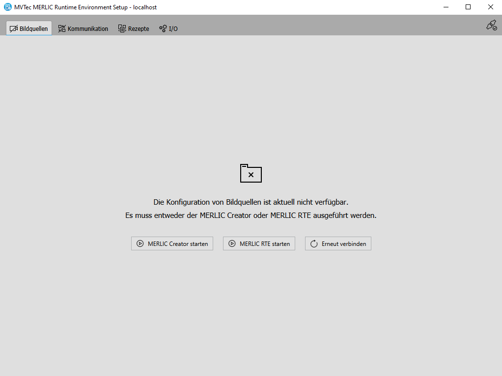 Wenn Sie mit dem lokalen System verbunden sind und die Verbindung zum Konfigurationsdienst für die Registerkarte „Bildquellen“ getrennt wurde, können Sie den MERLIC Creator bzw. das MERLIC RTE im MERLIC RTE Setup bequem über die entsprechenden Schaltflächen neu starten. Wenn Sie die Anwendungen außerhalb des MERLIC RTE Setups gestartet haben, z. B. über das Windows-Startmenü, können Sie die Verbindung zum jeweiligen Konfigurationsdienst auch über die Schaltfläche „Erneut verbinden“ wiederherstellen. Dies ist ebenfalls notwendig, wenn Sie mit einem Remote-System verbunden sind, weil Sie zuerst den MERLIC Creator oder das MERLIC RTE auf dem Remote-System starten müssen, damit die Verbindung zum Konfigurationsdienst über die Schaltfläche „Erneut verbinden“ wiederhergestellt werden kann. Allerdings gehen alle nicht gespeicherten Änderungen der Bildquellen-Konfiguration verloren, wenn die Verbindung zum Konfigurationsdienst getrennt wird.