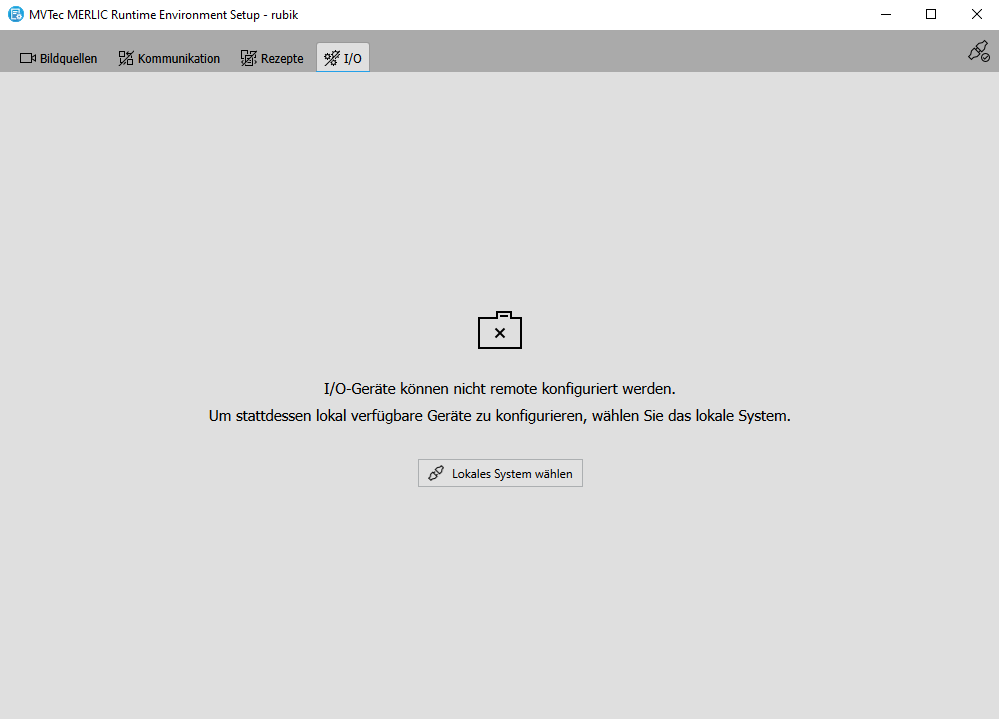 Bei Verbindung zu einem Remote-System mit dem MERLIC RTE Setup sind die Registerkarten „Rezepte“ und „I/O“ nicht verfügbar. Die Konfigurationsoptionen dieser Registerkarten sind nur für Rezepte und Kommunikationseinrichtungen auf dem lokalen System verfügbar. Im Gegensatz zu Communicator-Plugins, die remote konfiguriert werden können, können die Kommunikationseinrichtungen, für die MERLIC integrierte Plugins bereitstellt, nur auf dem lokalen System konfiguriert werden.