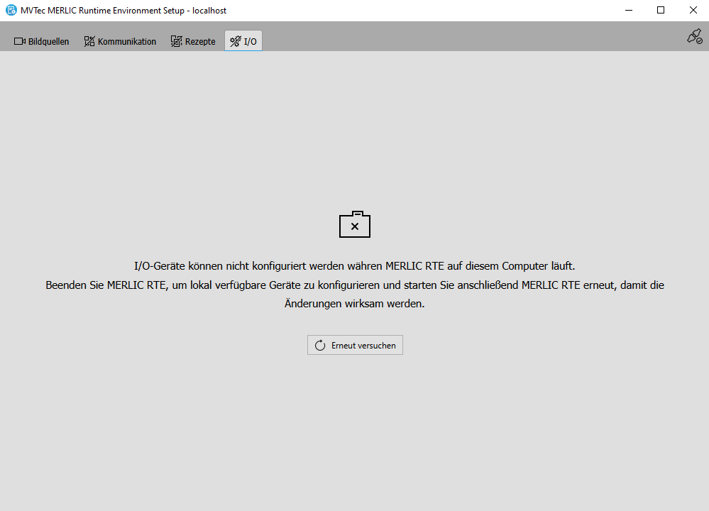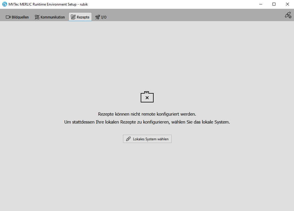Auf dem lokalen System können alle Konfigurationsoptionen des MERLIC RTE Setups verwendet werden. Sie können Bildquellen für den Bildeinzug konfigurieren, Rezeptdateien verwalten sowie Kommunikationseinrichtungen und Communicator-Plugins konfigurieren, die auf dem lokalen System verfügbar sind.
