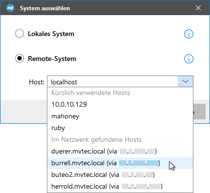 - Wählen Sie den Hostnamen oder die IP-Adresse des Systems aus, zu dem eine Verbindung hergestellt werden soll. Öffnen Sie das Dropdown-Menü und überprüfen Sie, ob das gewünschte System in der Liste verfügbar ist. Im Dropdown-Menü werden alle Systeme aufgelistet, zu denen in einer früheren Sitzung eine Verbindung hergestellt wurde. Darüber hinaus werden die Systeme im Netzwerk angezeigt, auf denen aktuell der Communicator oder das MERLIC RTE ausgeführt wird. Wenn das System, zu dem eine Verbindung hergestellt werden soll, nicht in der Liste aufgeführt ist, müssen Sie den Hostnamen oder die IP-Adresse des Remote-Systems manuell eingeben.
