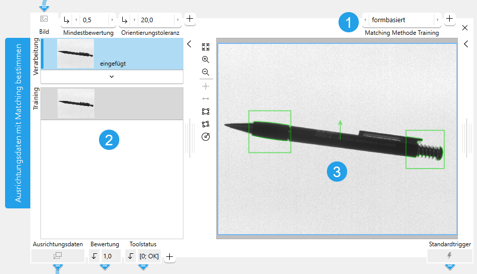 Verwenden Sie diese Methode, wenn die „Ausrichtungsdaten“ anhand einer Matching-Methode bestimmt werden sollen, die die besten Übereinstimmungen eines formbasierten Modells in einem Bild findet.