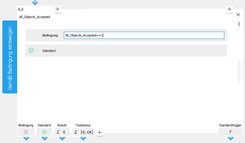 Das Symbol zeigt an, welcher Zweigtrigger aktiviert ist. Es ist immer ein Zweigtrigger aktiviert: Wenn die Bedingung erfüllt ist, wird die Verbindungsstelle „Bedingung“ aktiv und es wird ein Triggersignal gesendet. In jedem anderen Fall ist der Zweigtrigger „Standardwert“ aktiv und es wird ein Triggersignal gesendet, d. h., wenn die Bedingung nicht zutrifft, noch keine Bedingung definiert wurde oder sich das Tool in einem fehlerhaften Status befindet. Alle Tools, die mit der aktiven Verbindungsstelle verbunden sind, werden ausgeführt.