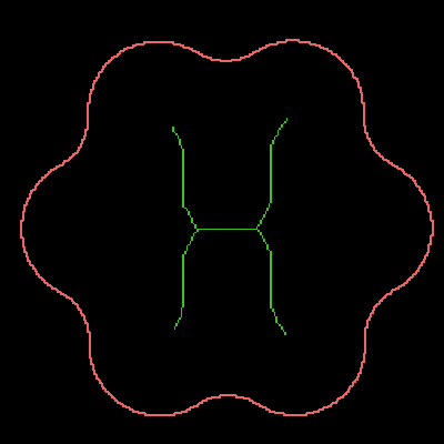 Mit dieser Methode können Sie das Skelett der einzelnen Regionen berechnen, d. h. die Mittelachse der Eingaberegionen. Das Skelett wird so aufgebaut, dass jeder Punkt auf dem Skelett als Mittelpunkt eines Kreises mit dem größtmöglichen Radius angesehen werden kann, der aber weiterhin vollständig in der Region enthalten ist. |