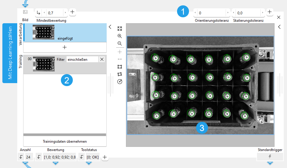Es wird empfohlen, die Werte von „Orientierungstoleranz“ und „Skalierungstoleranz“ gerade so groß festzulegen, dass alle gewünschten Objekte gefunden und gezählt werden, aber nicht größer, damit das Training nicht länger dauert als notwendig.