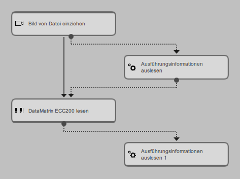 Im folgenden Beispiel können Sie die erforderlichen Triggerverbindungen sehen, wenn die Ausführungszeit des Tools DataMatrix ECC 200 lesen gemessen wird. Die erste Triggerverbindung wird von Bild von Datei einziehen zum ersten Ausführungsinformationen auslesen-Tool erstellt, weil „Bild von Datei einziehen“ das einzige Tool ist, das Daten an das zu messende Tool sendet. Die Triggerverbindungen vom ersten „Ausführungsinformationen auslesen“-Tool zu „DataMatrix ECC 200 lesen“ und der Trigger von „DataMatrix ECC 200 lesen“ zum zweiten „Ausführungsinformationen auslesen“-Tool gewährleisten, dass die Tools in der richtigen Reihenfolge ausgeführt werden.