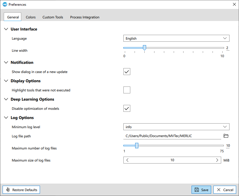 In the following, the available options in the tabs are described. For some preferences, it is necessary to restart MERLIC to make the changes effective. You can restore the default settings of the available options using the button " Restore Defaults". However, only the settings in the active tab card are restored.