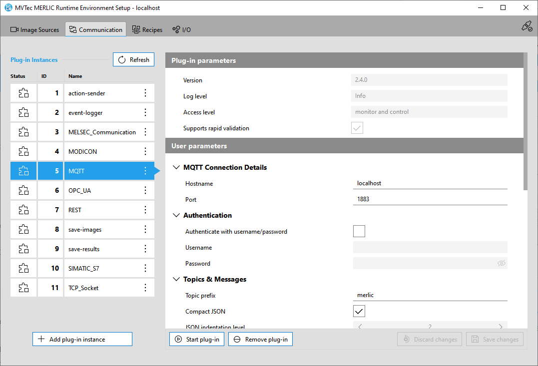The " Communication" tab of the MERLIC RTE Setup enables you to configure all types of Communicator plug-ins, i.e., plug-ins that need to be started via the MERLIC Communicator for the process integration. Communicator plug-ins can be instantiated multiple times, i.e., you can use multiple instances of a plug-in with an individual configuration. In the MERLIC RTE Setup, you can therefore work with instances of the respective plug-in. If you add a new plug-in instance, you can check the current configuration for this instance and adjust the available user parameters that have been defined in the implementation of the respective plug-in. In addition, you can also start and stop the selected instances of the Communicator plug-ins in the MERLIC RTE Setup.