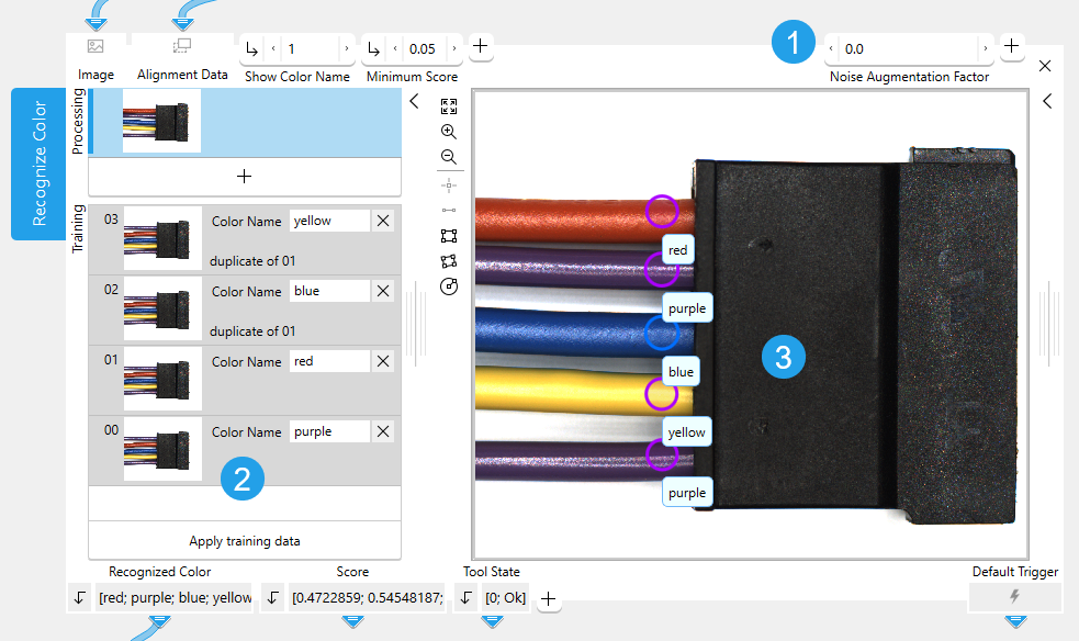 This tool is used with a training mode. This means that first a training is performed based on training images defining classes of colors and the training parameters. After the training, the colors can be checked within one or multiple search areas in the image. These search areas can be defined by detection regions or regions of interest (ROIs).