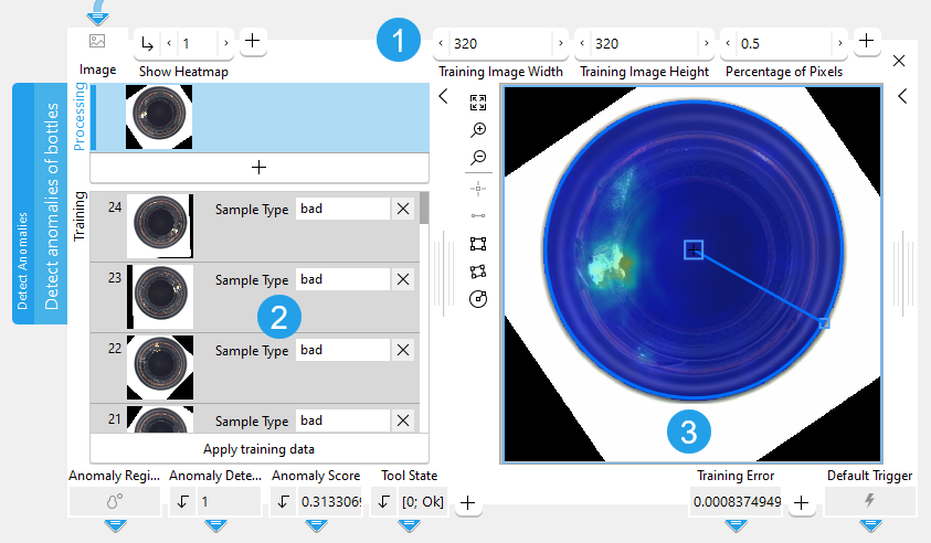 This tool is used with a training mode. This means that first a training is performed based on the selected samples of training images with and without anomalies and specified training parameters. Training images with "bad" samples, i.e., images that show anomalies, are not required but they can help to improve the deep learning model.