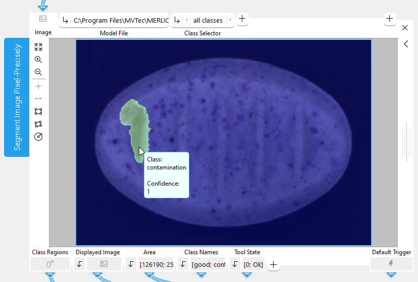 When moving the mouse pointer over the image in the Tool Board, a label with information on the segmentation is displayed at the mouse pointer. It shows the name of the class that is assigned to the pixel at the current mouse position as well as the corresponding confidence. The tool also recognizes regions of pixels belonging to the same class and you can configure which of these regions are displayed in the image. For more information, see the description of the parameter Class Selector.