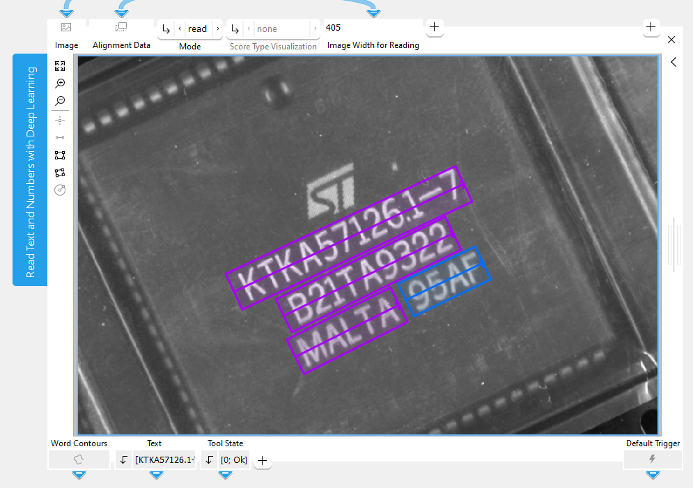 In contrast to the existing MERLIC tool Read Text and Numbers, this tool uses a holistic deep-learning-based approach for optical character recognition (OCR). It localizes characters more robustly regardless of their position, orientation, and font type. Characters are automatically grouped which allows the identification of whole words. Due to this, misinterpretation of characters with similar appearances can be avoided and the reading performance increases.