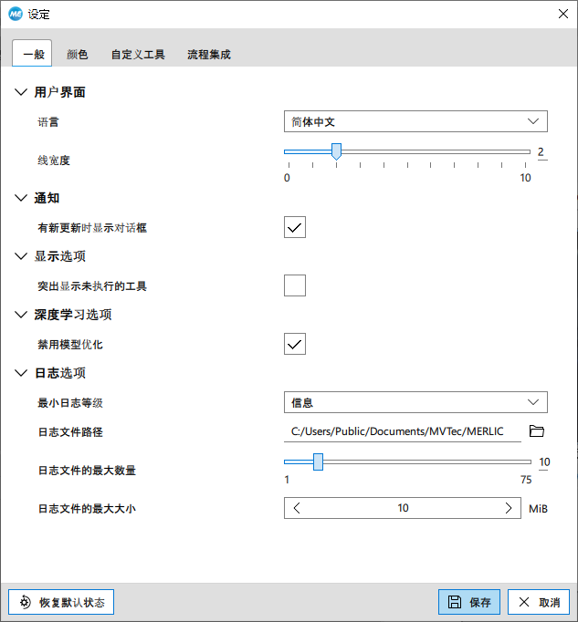 MERLIC 提供了一种日志记录机制,可自动将日志消息写入默认目录 %LOCALAPPDATA%\MVTec\MERLIC\ 中的相应日志文件。要访问 MERLIC Creator 中的日志文件,您可以使用菜单项“帮助 → 打开日志文件目录”。