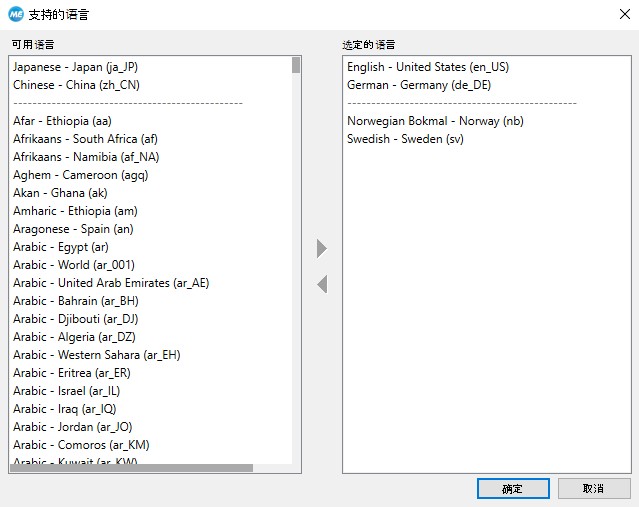 - 单击 Designer 菜单条目“本地化”,然后选择“选择语言...”以打开受支持语言的对话框。可用语言列表在对话框左侧显示。它由许多不同的语言的组成,包括特定于某个国家的语言。右侧显示 Frontend 中将提供的语言的列表。