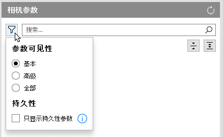 您可以筛选相机参数列表,以仅显示相关参数。可通过“所有参数”选项卡顶部的 按钮打开筛选器选项。可使用以下筛选器类别: “参数可见性”和“持久性”。