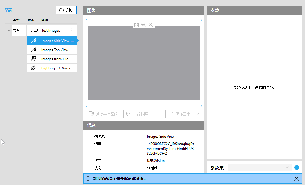 - 将自动选择图像源用于配置。因此,图像源的一般信息以及配置设置将自动显示于右侧。但是,仅当激活配置时,才可对配置进行设置。在下面的示例图像中,可以看到相机参数尚不可用。要访问参数,您首先必须激活新图像源已添加到的配置。有关如何配置图像源以及提供哪些配置选项的更多信息,请参阅配置图像源主题。