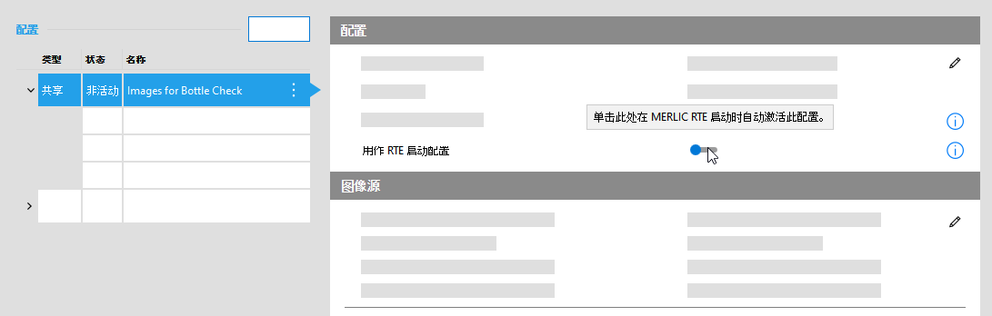 如果连接至在早于 MERLIC 5.1 的 MERLIC 版本上运行的 MERLIC Creator 或 MERLIC RTE,则无法在 MERLIC RTE Setup 中重命名配置和图像源。在这种情况下, 图标将灰显。请务必使用最新 MERLIC 版本的 MERLIC Creator 或 MERLIC RTE。