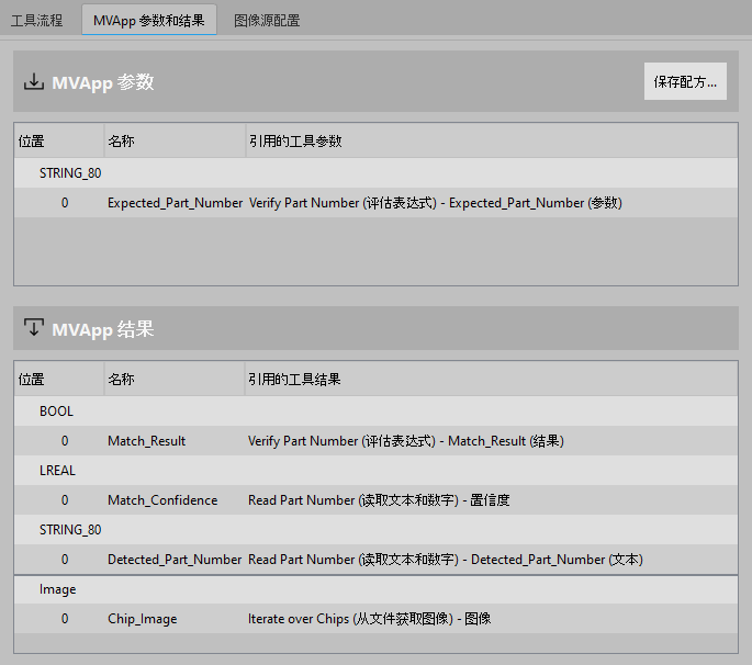 “MVApp 结果”表示的是:在流程集成 MERLIC 用于集成在制造机器中的机器视觉系统。机器控制器(例如,可编程逻辑控制器 [PLC])必须能够控制集成视觉系统、监控执行情况和查询结果。因此,MERLIC 提供了一个流程集成模式以支持与机器控制器的通信。 可使用应用程序“MERLIC RTE”在流程集成模式下启动,该应用程序随 MERLIC 安装一起提供。模式下使用 MERLIC 时,外部通信源(例如,可编程逻辑控制器 [PLC])可以访问的 MERLIC 工具的结果。要启用工具结果的传输,必须定义要将哪些工具结果设置为可传输到外部源,并将这些工具结果添加到 MVApp 结果。如果您在使用 Communicator 插件,还可以将工具的图像结果添加到 MVApp 结果 中,以便将生成的图像传输到相应的插件。