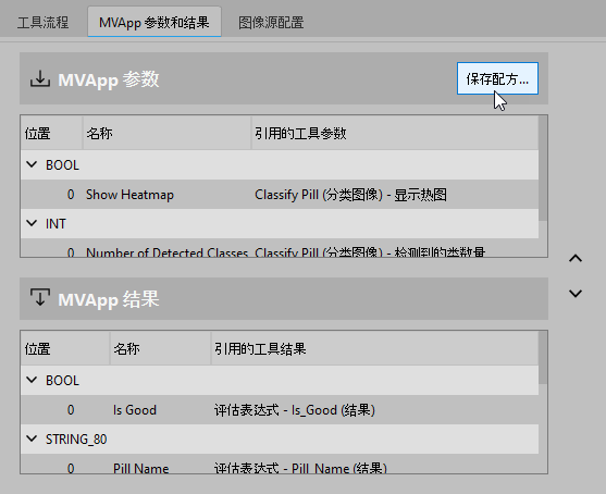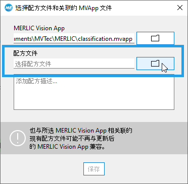 - 单击“保存”按钮,保存所选 MVApp 并创建文件后缀为“.mrcp”的配方文件。选择 MVApp 和配方文件后,将立即激活该按钮。