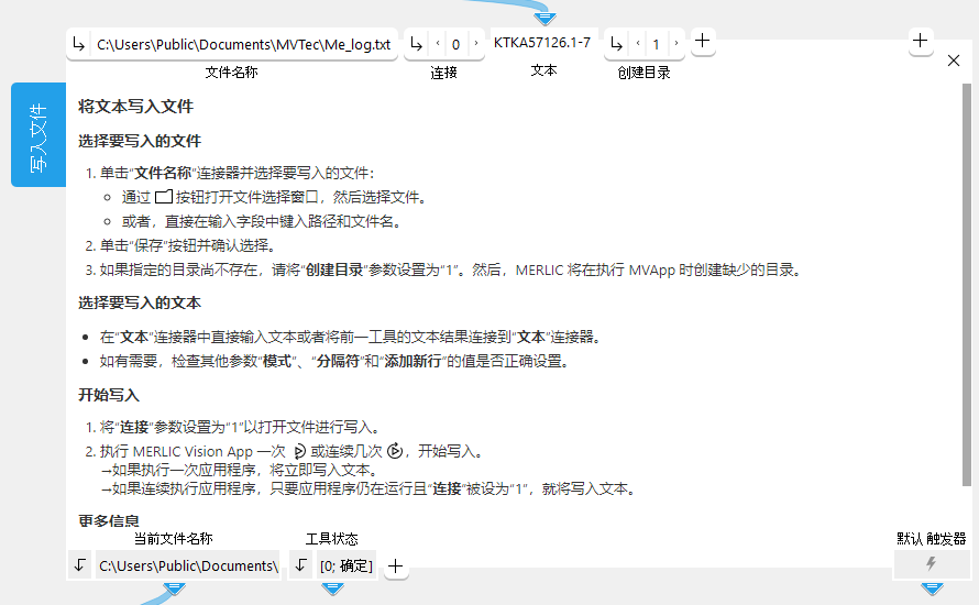 在参数“文件名称”中输入路径和文件名。如果连接器“连接”设置为 1 并且执行“MVApp”,则“MVApp”将创建并打开文件。只要文件由 MVApp 打开,就不能被其他流程使用。如果“连接”设置为 1,则 MVApp 每次执行时都会应用写入操作。使用执行 MERLIC 一次的按钮 ,以单步执行此工具。此功能允许您逐步写入文本。将连接器“连接”设为 0 可以关闭文件。