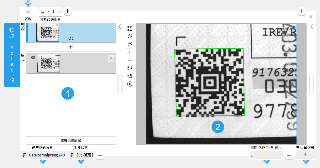使用此工具可检测和读取图像中的一个或多个 Aztec 型代码。如果添加此工具,会自动扫描当前的处理图像,并且默认情况下会读取图像上的第一个 Aztec 代码。