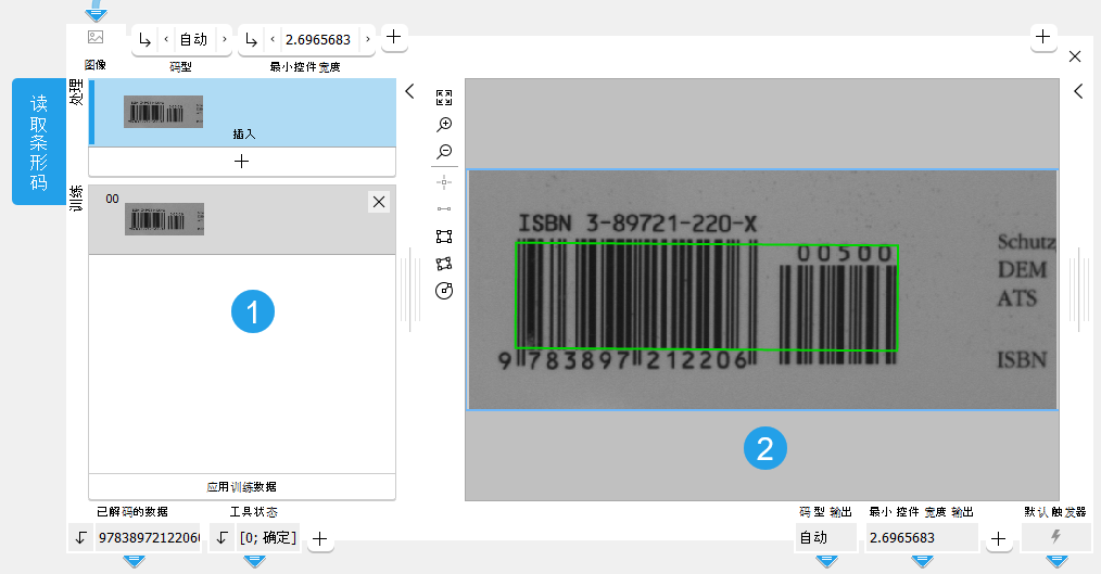 - 单击“应用训练数据”按钮执行训练。系统将自动确定一系列训练图像的参数。此外,工具还会自动切换为处理模式,并在当前图像中显示检测到的代码。