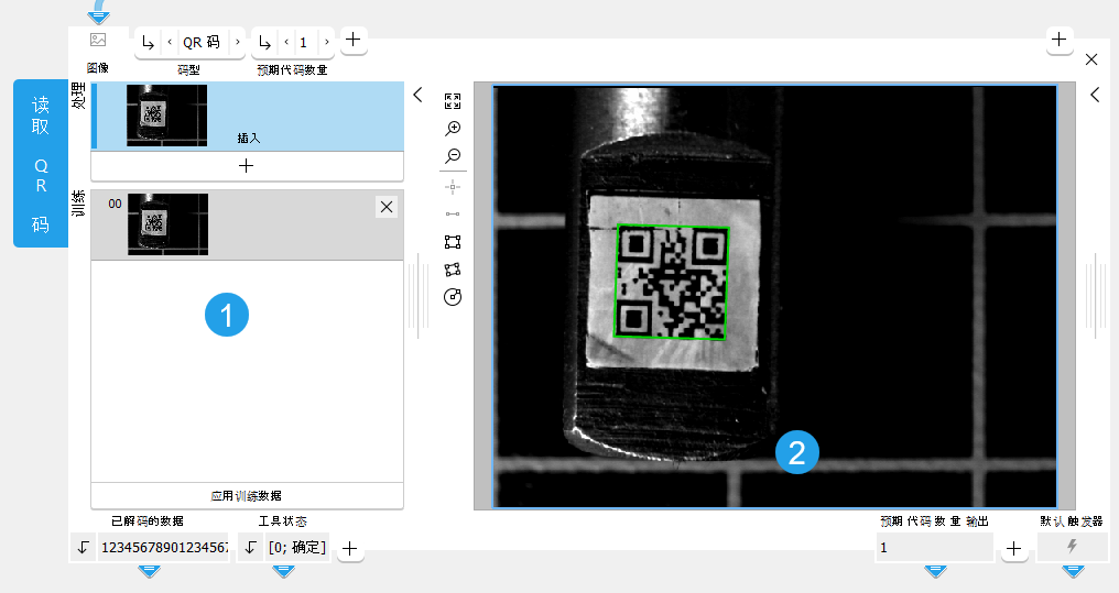- 单击“应用训练数据”按钮执行训练。系统将自动确定一系列训练图像的参数。此外,工具还会自动切换为处理模式,并在当前图像中显示检测到的代码。