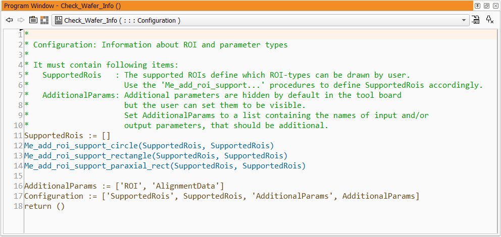 - Now, you can define the desired ROIs and additional parameters and provide them in the "Configuration" parameter. The "_Info" procedure of your example custom tool "Check_Wafer" looks like this: