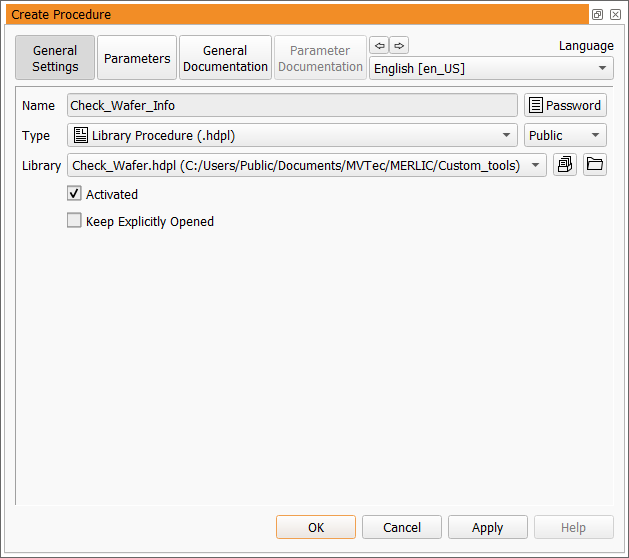 - Enter the name of the "_Info" procedure. Keep in mind that the name must be composed of the tool name and the suffix "_Info" as described in the section Name. For our example custom tool "Check_Wafer", the procedure name would be "Check_Wafer_Info".