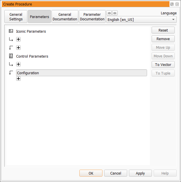 List of tool parameters and results that should not visible on the tool board by default but can be added by the user via the + button next to the tool parameters or results, respectively. Keep in mind that all tool parameters and tool results must be defined in the execute procedure of the custom tool as described in the topic Defining the Procedure Settings. Thus, you can define only tool parameters or result as additional if they have already been defined in the procedure settings of the custom tool. If you do not want to define any of the tool parameters and result as additional tool parameters or additional tool results, you can set the value to an empty tuple, i.e., AdditionalParams := []. |