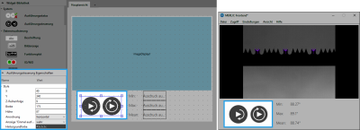 Mit diesem Widget können Sie die Ausführung Ihrer Anwendung steuern, d. h. die Ausführung Ihrer MERLIC-Vision-App starten und stoppen. Standardmäßig ist auch die Schaltfläche „Einmal ausführen“ für die einzelne Ausführung der Schritte aktiviert. Wenn Sie nur die ständige Ausführung der Anwendung zulassen möchten, können Sie die Einstellungen in der Eigenschaft „Anzeige „Einmal ausführen““ anpassen.
