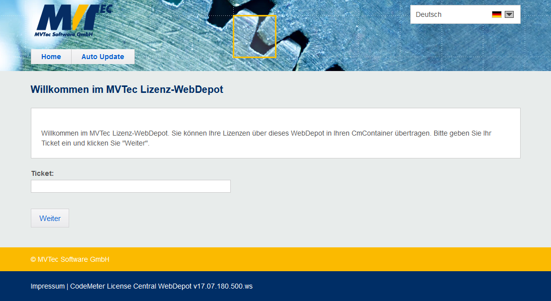 - Schließen Sie den Dongle an Ihren Computer an und öffnen Sie das WebDepot für MVTec-Lizenzen in einem Internetbrowser.