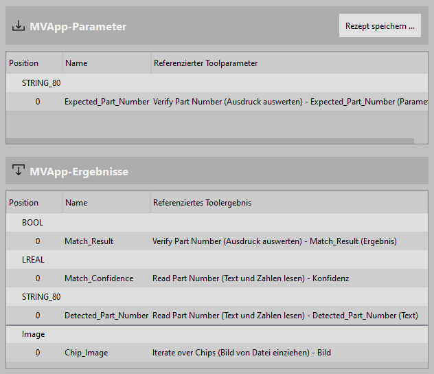 Die Tabelle enthält Informationen für alle MVApp-Ergebnisse. Dies umfasst den Namen des MVApp-Ergebnisses, Informationen zum referenzierten Toolergebnis, den jeweiligen Datentyp und auch die Position des MVApp-Ergebnisses innerhalb des jeweiligen Datentyps.