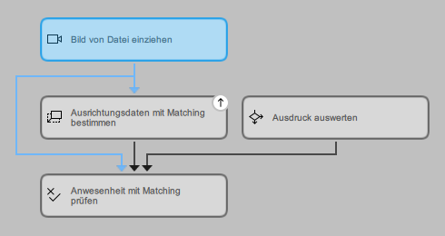 Darüber hinaus wird das jeweilige Tool im Tool-Flow-Panel mit dem Symbol gekennzeichnet, um darauf hinzuweisen, dass mindestens ein Ergebnis dieses Tools an die externe Quelle übertragen wird. Im folgenden Beispielbild weist das Symbol am Tool Ausrichtungsdaten mit Matching bestimmen darauf hin, dass mindestens ein Toolergebnis dieses Tools als MVApp-Ergebnis festgelegt ist.