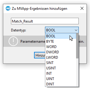 - Wählen Sie den Datentyp in der Dropdown-Liste aus. Bei einem Bildergebnis ist der Datentyp bereits vorgegeben und kann nicht geändert werden. Für alle anderen Ergebnisse können Sie verschiedene Datentypen des Standards IEC 61131 auswählen. Weitere Informationen zu den Datentypen finden Sie unter Unterstützte Datentypen.