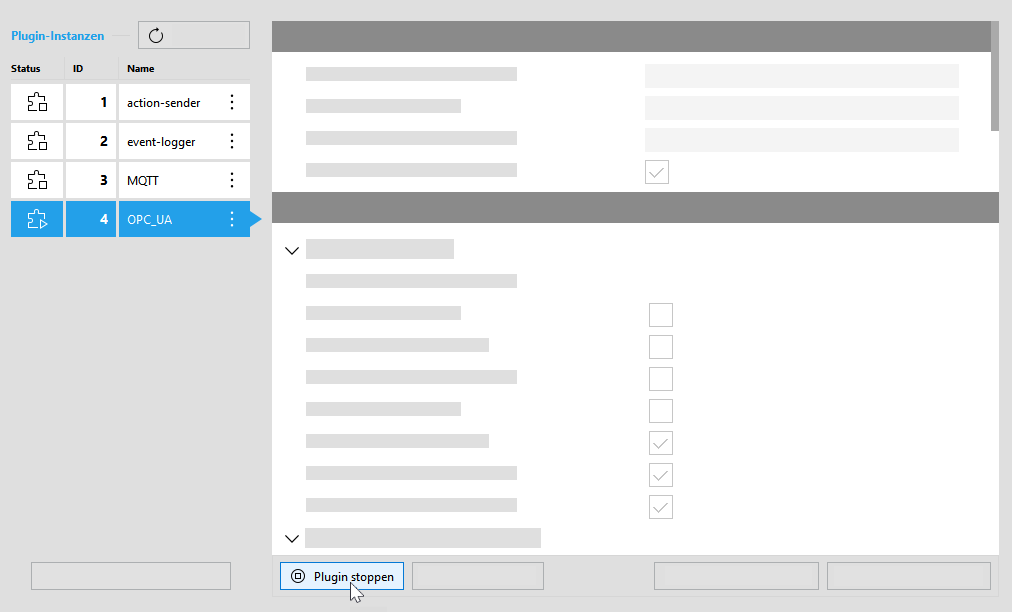 1. Wählen Sie das gewünschte Plugin in der Liste der Plugin-Instanzen auf der linken Seite aus.