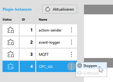 Sie haben folgende Möglichkeiten, um eine Plugin-Instanz auf der MERLIC RTE Setup-Registerkarte „Kommunikation“ zu beenden: